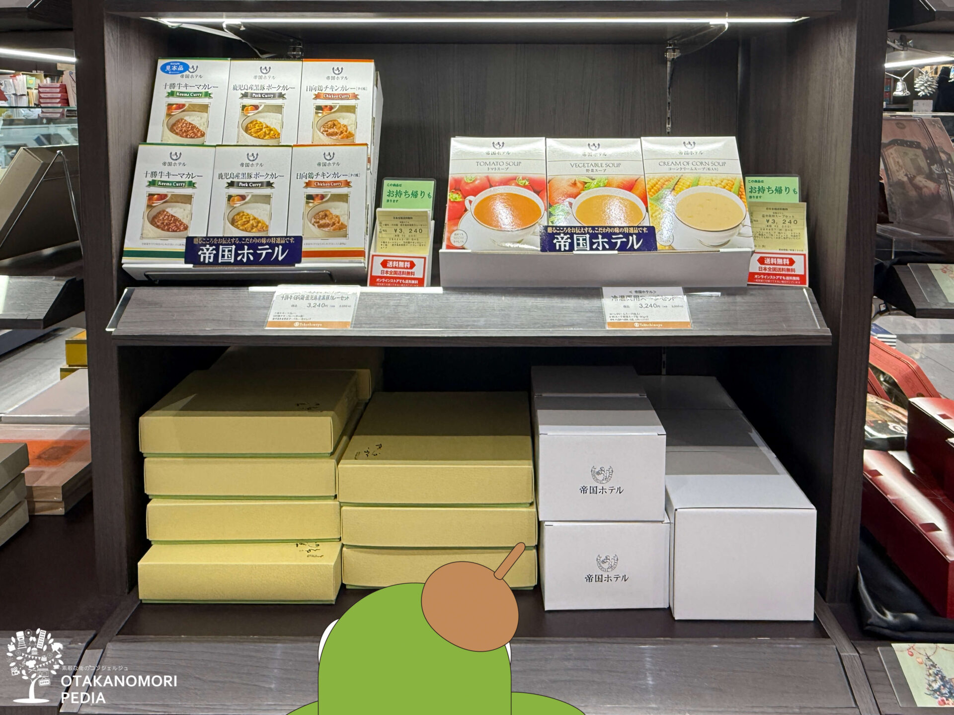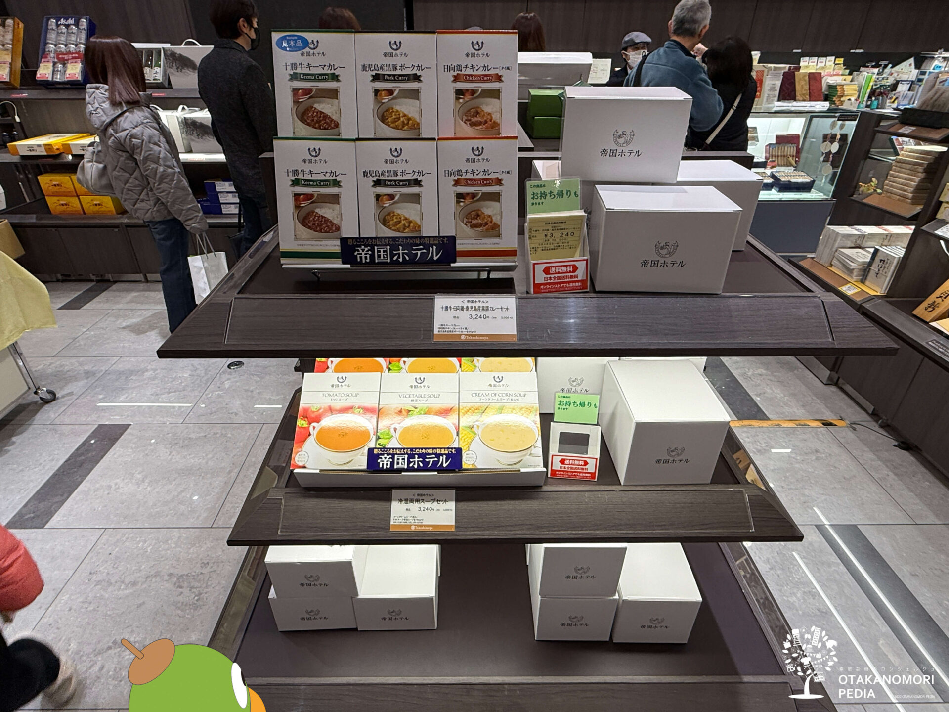 帝国ホテルといえば焼き菓子のイメージもありますが、おおたかの森の店頭(※2025年12月・こたか調べ)では、主に「カレー詰合せ」と「スープ詰合せ」の2本立てで選びやすい印象でした。